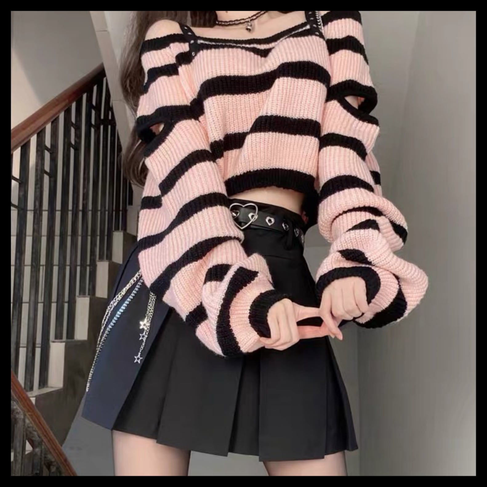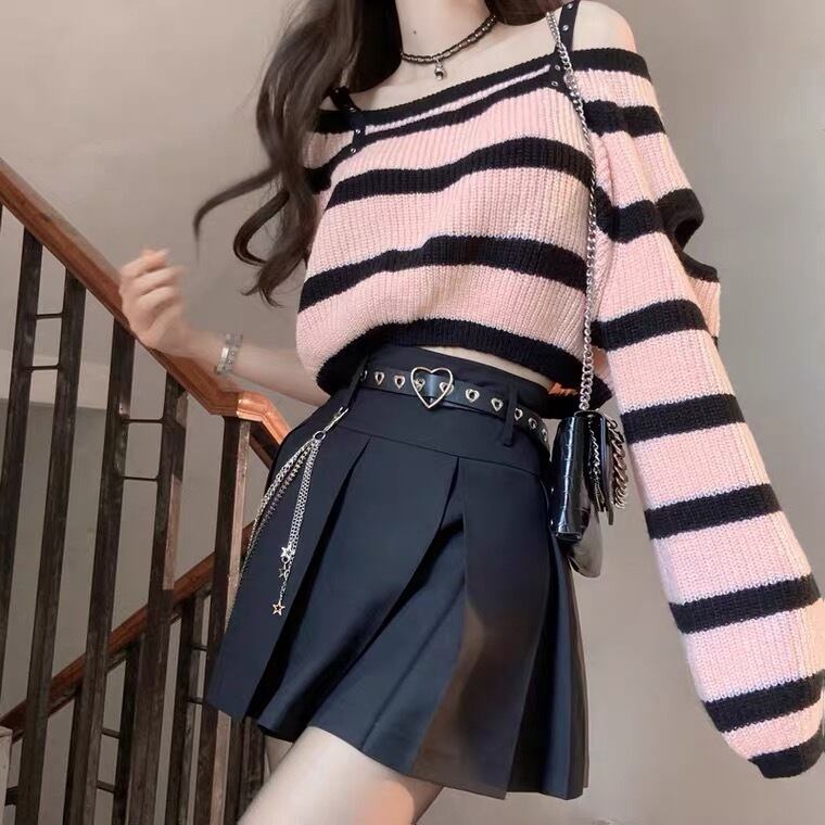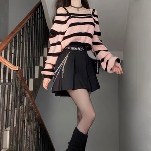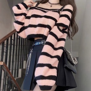【お取り寄せ】地雷 パンク ピンク ボーダー ショート ニット トップス